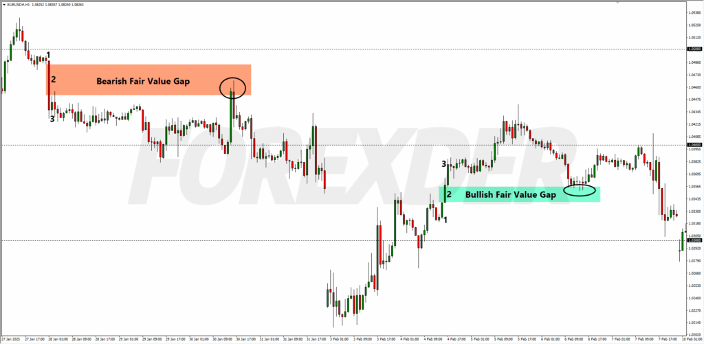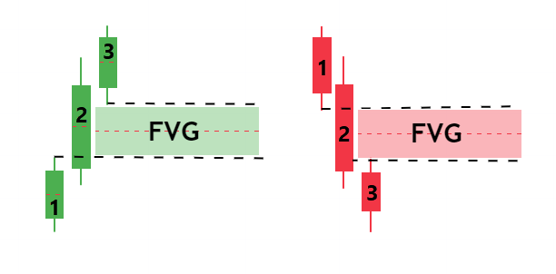 FVG เป็นรูปแบบสามแท่งเทียน โดยแท่งเทียนตรงกลางมีขนาดใหญ่เมื่อเทียบกับแท่งทางซ้ายและขวา และไม่มีการทับซ้อนกันระหว่างไส้เทียนของแท่งแรกและแท่งที่สาม