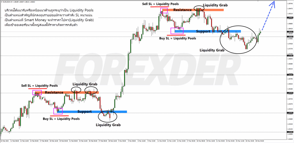 ความสำคัญในฐานะเป้าหมายสำหรับการดำเนินการคำสั่งซื้อขายของสถาบัน: Smart Money มักจะกำหนดเป้าหมายไปยังบริเวณที่มีสภาพคล่องสูงเพื่อซื้อ (สะสม) หรือขาย (กระจาย) สถานะจำนวนมากโดยไม่ทำให้เกิดการเคลื่อนไหวของราคาที่สำคัญ สถาบันจะเคลื่อนย้ายตลาดไปยังบริเวณเหล่านี้เพื่อดึงคำสั่งซื้อในรูปแบบของคำสั่งหยุดขาดทุน, คำสั่งทำกำไร และคำสั่งทะลุ บริเวณเหล่านี้ให้สภาพคล่องสำหรับการเคลื่อนไหวของราคาต่อไป Smart money แสวงหาสภาพคล่องเพื่อเติมเต็มสถานะของตนเอง โดยมักจะสร้างการเคลื่อนไหวที่รุนแรงเพื่อกระตุ้นคำสั่งซื้อขายของรายย่อยก่อนที่จะกลับตัว การทำความเข้าใจว่าสภาพคล่องอยู่ที่ใดช่วยคาดการณ์ว่าราคาจะเคลื่อนไหวไปในทิศทางใดต่อไป สถาบันต้องการสภาพคล่องเพื่อดำเนินการคำสั่งซื้อขายจำนวนมากโดยไม่รบกวนตลาด ราคามักถูกออกแบบมาให้กวาดผ่านจุดสูงสุดและจุดต่ำสุดเหล่านี้เพื่อนำคำสั่งหยุดขาดทุนออกไปก่อนที่จะมีการเคลื่อนไหวตามทิศทางที่แท้จริง