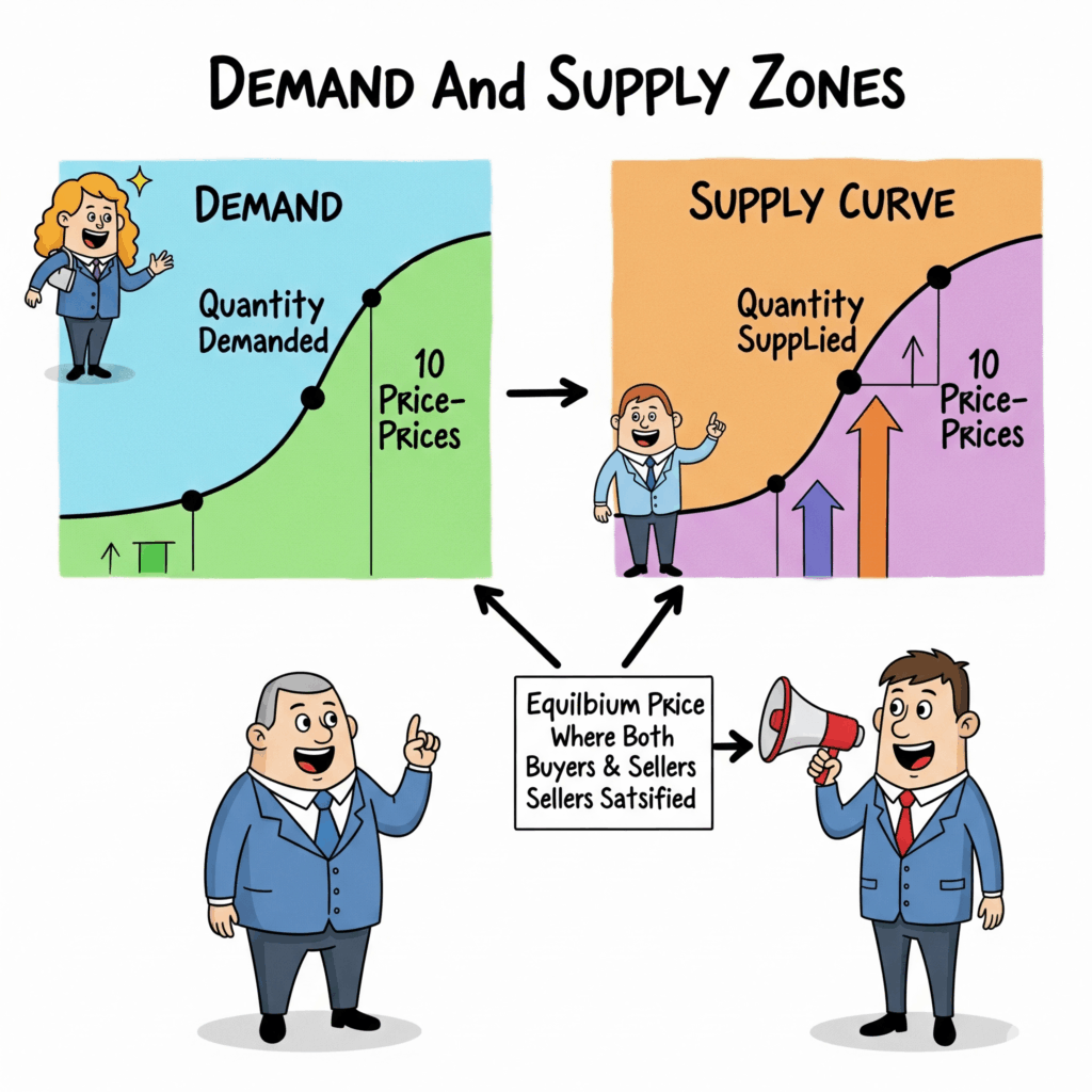 Demand Supply Zones (D&S Zones) คือพื้นที่บนกราฟราคาที่คาดการณ์ว่าจะเกิดกิจกรรมการซื้อหรือขายจำนวนมาก ซึ่งส่งผลต่อการเคลื่อนไหวของราคาอย่างมีนัยสำคัญ แนวคิดนี้อิงตามหลักเศรษฐศาสตร์พื้นฐานที่ว่าราคาของสินทรัพย์ทางการเงินถูกขับเคลื่อนด้วยความสมดุลระหว่างผู้ขาย (อุปทาน) และผู้ซื้อ (อุปสงค์) เมื่ออุปสงค์มีมากกว่าอุปทาน ราคามักจะสูงขึ้น และเมื่ออุปทานมีมากกว่าอุปสงค์ ราคามักจะลดลง