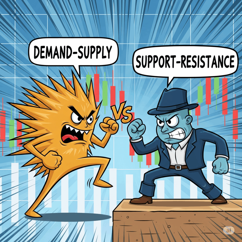 แม้ D&S Zones จะคล้ายคลึงกับแนวรับแนวต้าน แต่มีความแตกต่างที่สำคัญ D&S Zones ไม่ใช่แค่จุดราคาเดียว แต่เป็น “พื้นที่” หรือ “โซน” ที่กว้างกว่า แนวรับแนวต้านแบบดั้งเดิมมักจะอยู่ที่จุดกลับตัวของราคา (price turning points) ในขณะที่ D&S Zones มักจะอยู่ที่ “ต้นกำเนิด” ของการเคลื่อนไหวของราคาที่รุนแรงและมีโมเมนตัมสูง