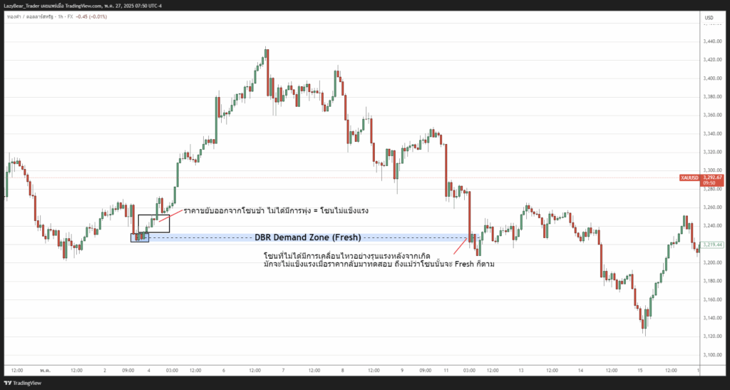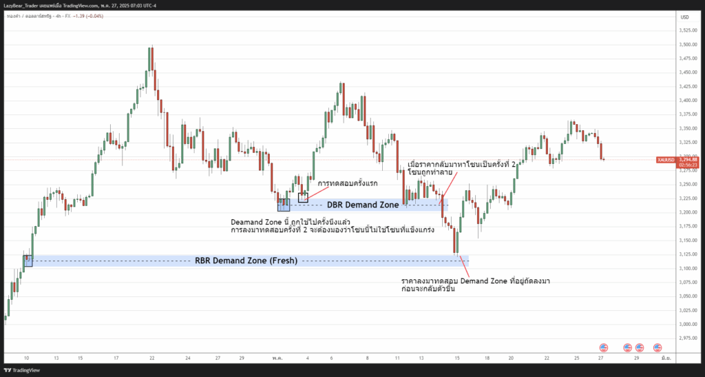 การเทรดโซนเก่าที่ถูกทดสอบแล้ว: Demand Supply Zones มักจะทำงานได้เพียงครั้งเดียว เมื่อราคาได้กลับมาทดสอบโซนและเกิดการกลับตัวไปแล้ว โอกาสที่โซนนั้นจะทำให้เกิดการกลับตัวอีกครั้งจะต่ำมาก นี่เป็นเพราะคำสั่งซื้อขายของสถาบันที่สร้างโซนนั้นอาจถูกเติมเต็มไปแล้ว นักเทรดควรให้ความสำคัญกับโซนที่ “สดใหม่” ที่ราคายังไม่เคยกลับมาทดสอบเลย